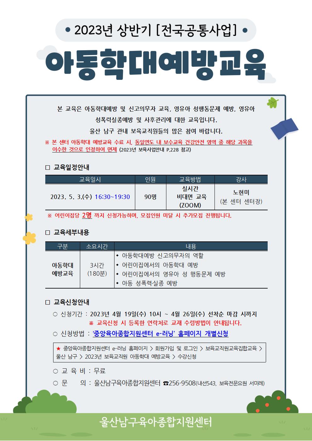 - A: 네, 한국보육진흥원 e러닝 안전교육은 연간 의무교육으로 매년 이수해야 합니다.